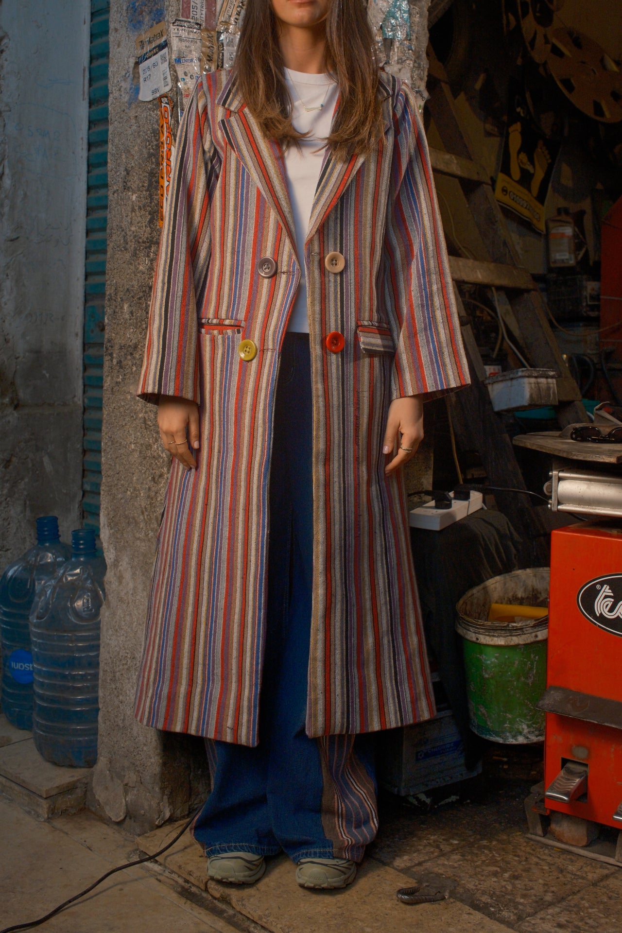 Made from reclaimed Egyptian car-cover fabric. Each trench is made to order, stitched individually in Cairo, meaning it’s made especially for you.
